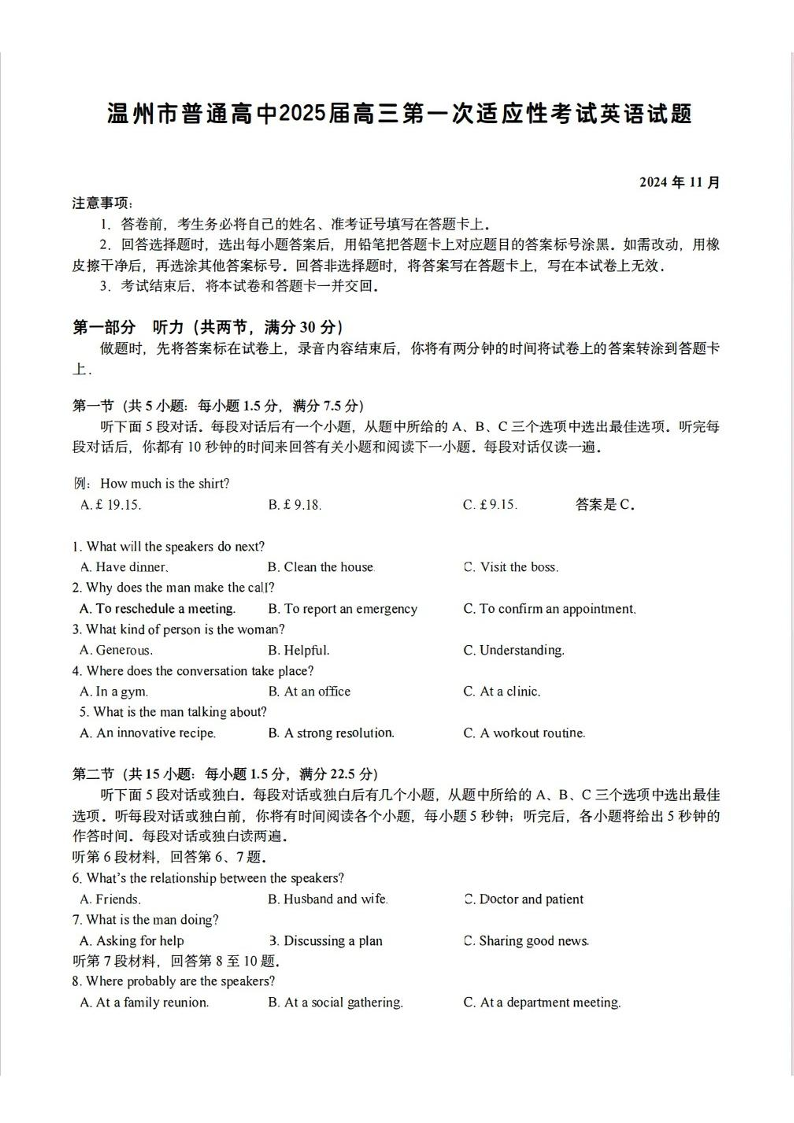 浙江省温州市普通高中2025届高三第一次适应性考试+英语