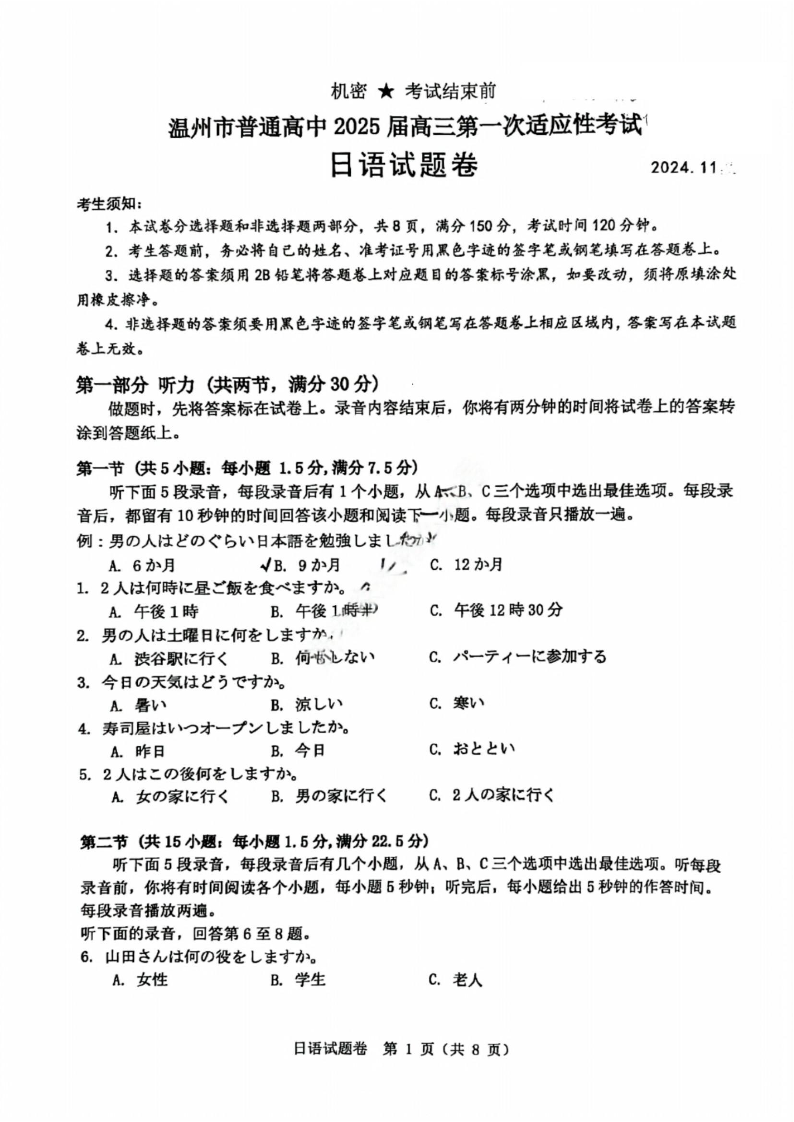 浙江省温州市普通高中2025届高三第一次适应性考试+日语