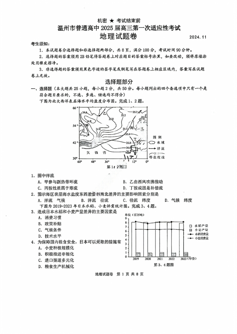 浙江省温州市普通高中2025届高三第一次适应性考试+地理