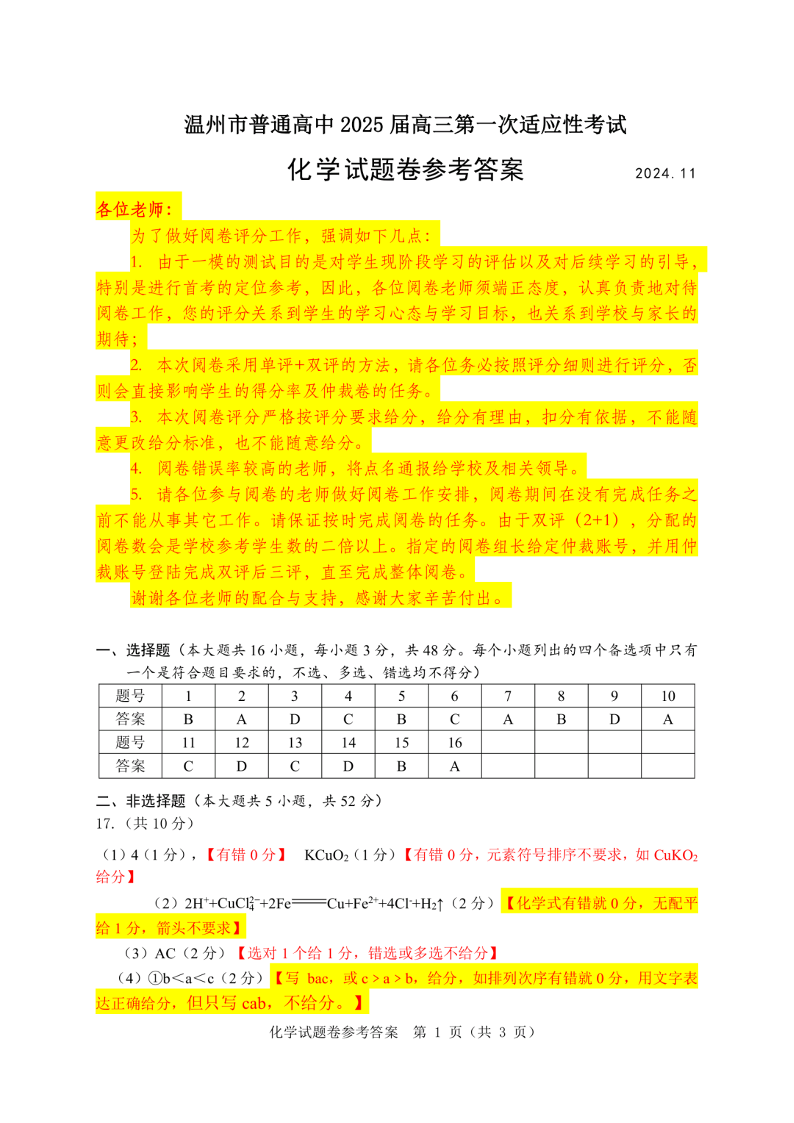 浙江省温州市普通高中2025届高三第一次适应性考试+化学答案