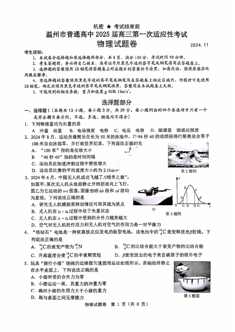 浙江省温州市普通高中2025届高三第一次适应性考试+物理