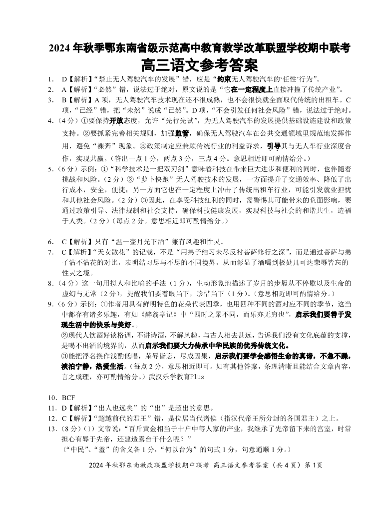 2025届湖北省鄂东南示范高中高三11月期中联考语文答案