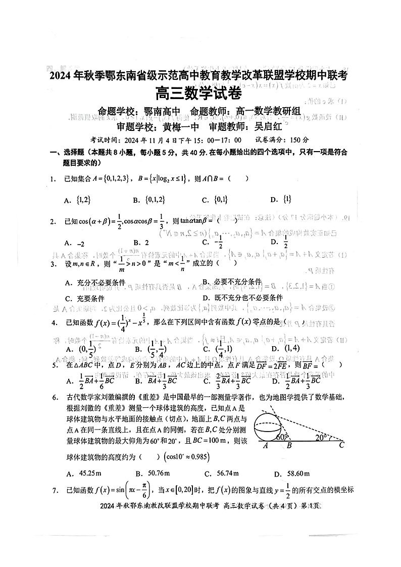 2025届湖北省鄂东南示范高中高三11月期中联考数学试题