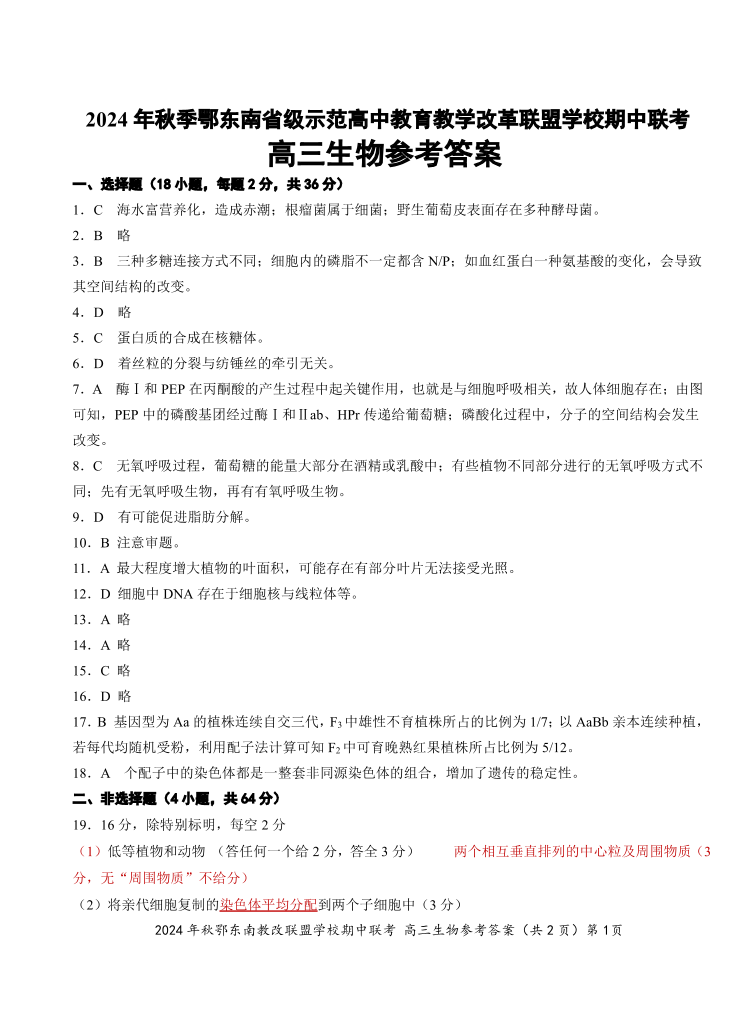 2025届湖北省鄂东南示范高中高三11月期中联考生物答案