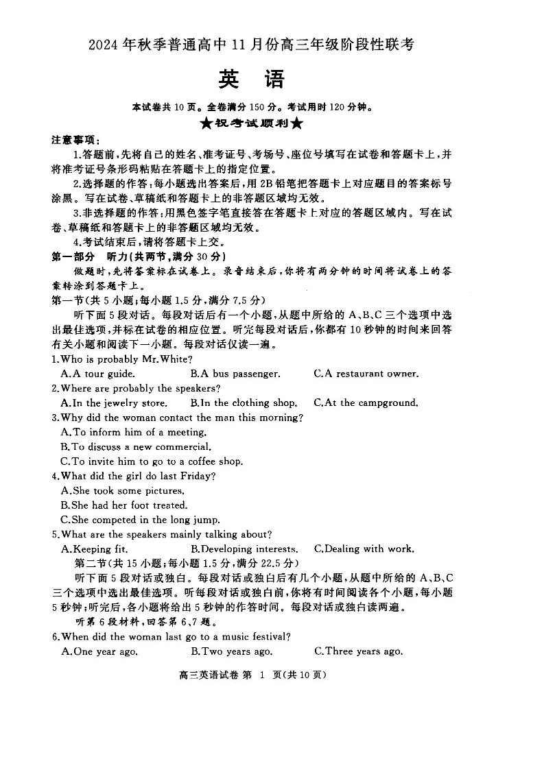 2025届湖北省鄂东协作体秋季普通高中11月份高三阶段性联考英语试卷
