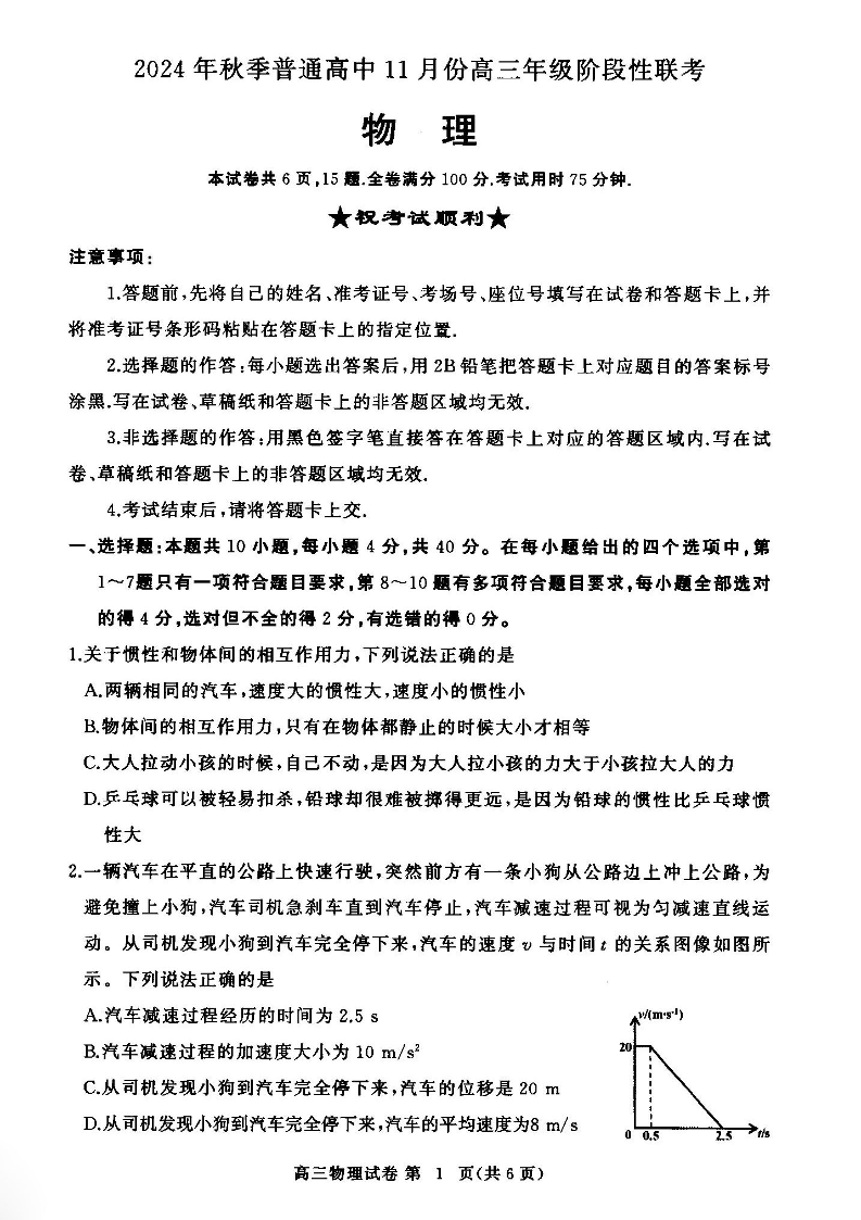 2025届湖北省鄂东协作体秋季普通高中11月份高三阶段性联考物理试卷