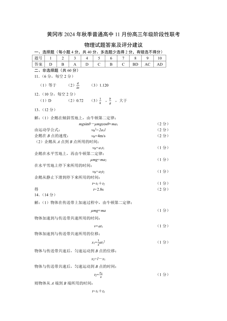 2025届湖北省鄂东协作体秋季普通高中11月份高三阶段性联考物理答案