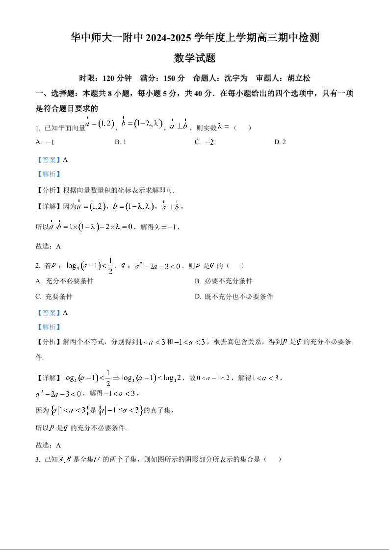 湖北省华中师大一附中2024-2025学年度上学期高三期中检测+数学答案
