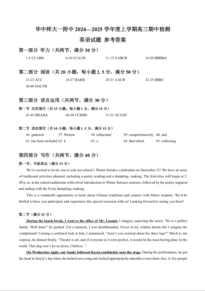 湖北省华中师大一附中2024-2025学年度上学期高三期中检测+英语答案