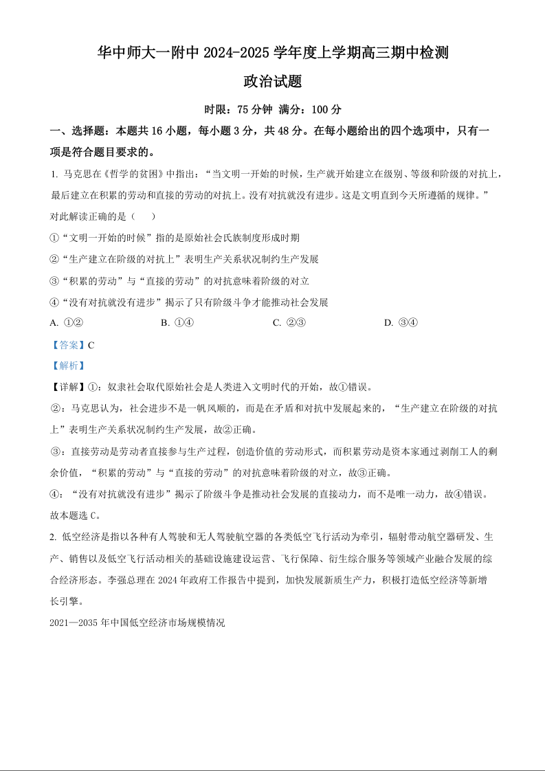 湖北省华中师大一附中2024-2025学年度上学期高三期中检测+政治答案