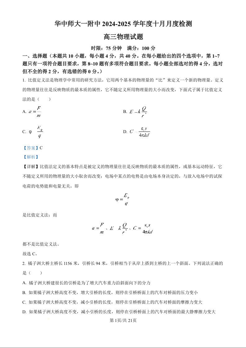 华中师大一附中2024-2025学年度十月月度检测+物理答案