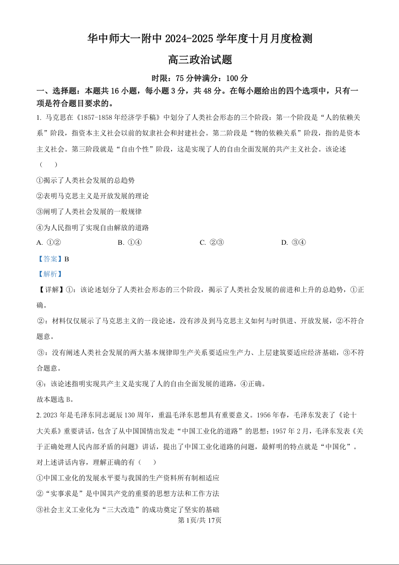 华中师大一附中2024-2025学年度十月月度检测+政治答案