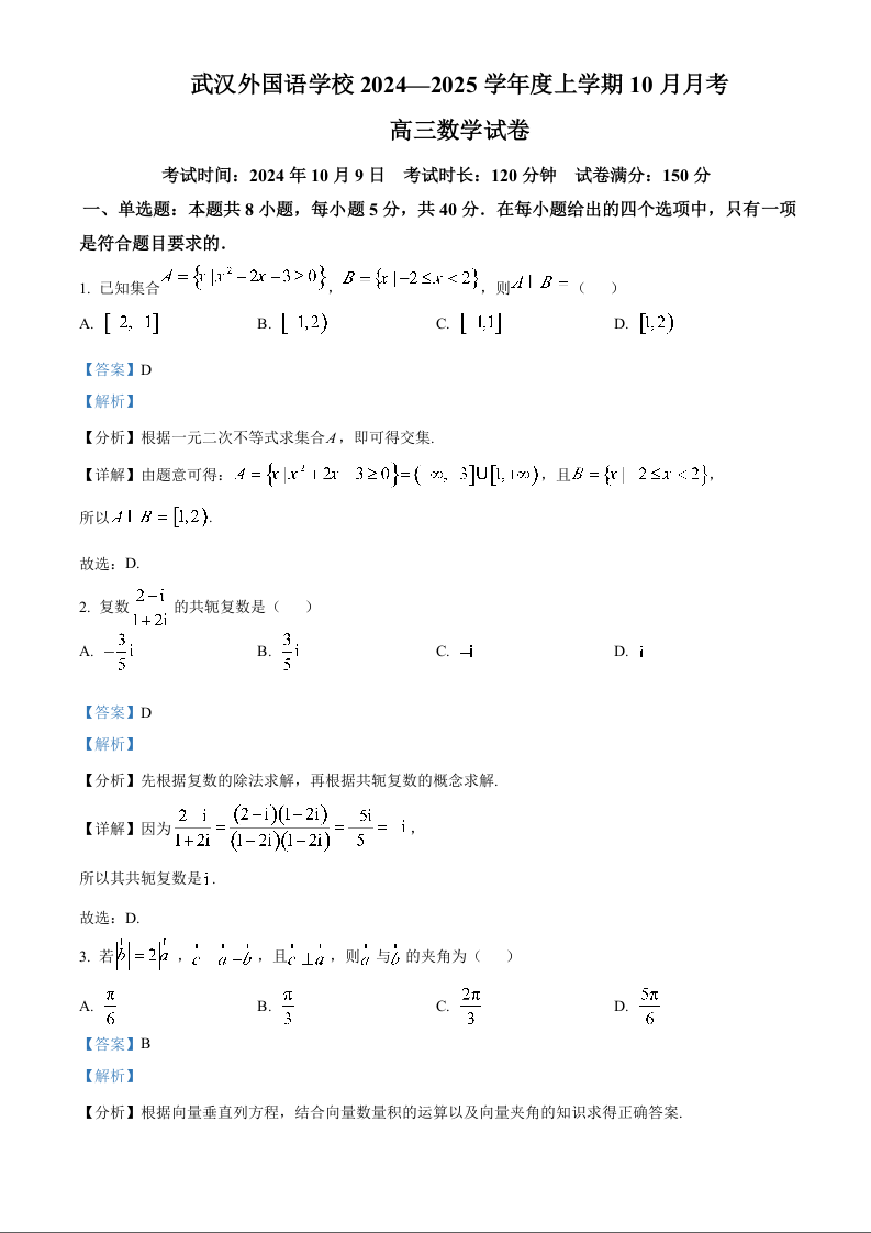 武汉外国语学校2024-2025学年度上学期10月阶段性诊断考试+数学答案