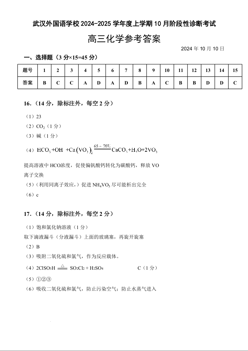 武汉外国语学校2024-2025学年度上学期10月阶段性诊断考试+化学答案