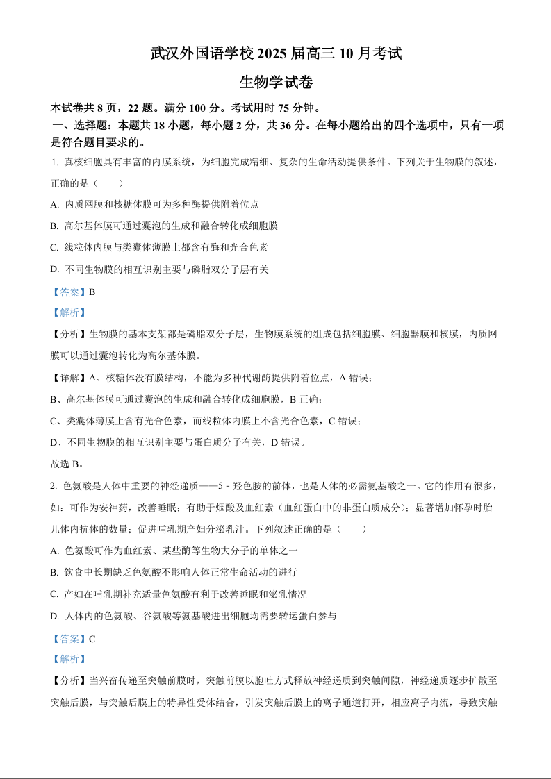 武汉外国语学校2024-2025学年度上学期10月阶段性诊断考试+生物答案