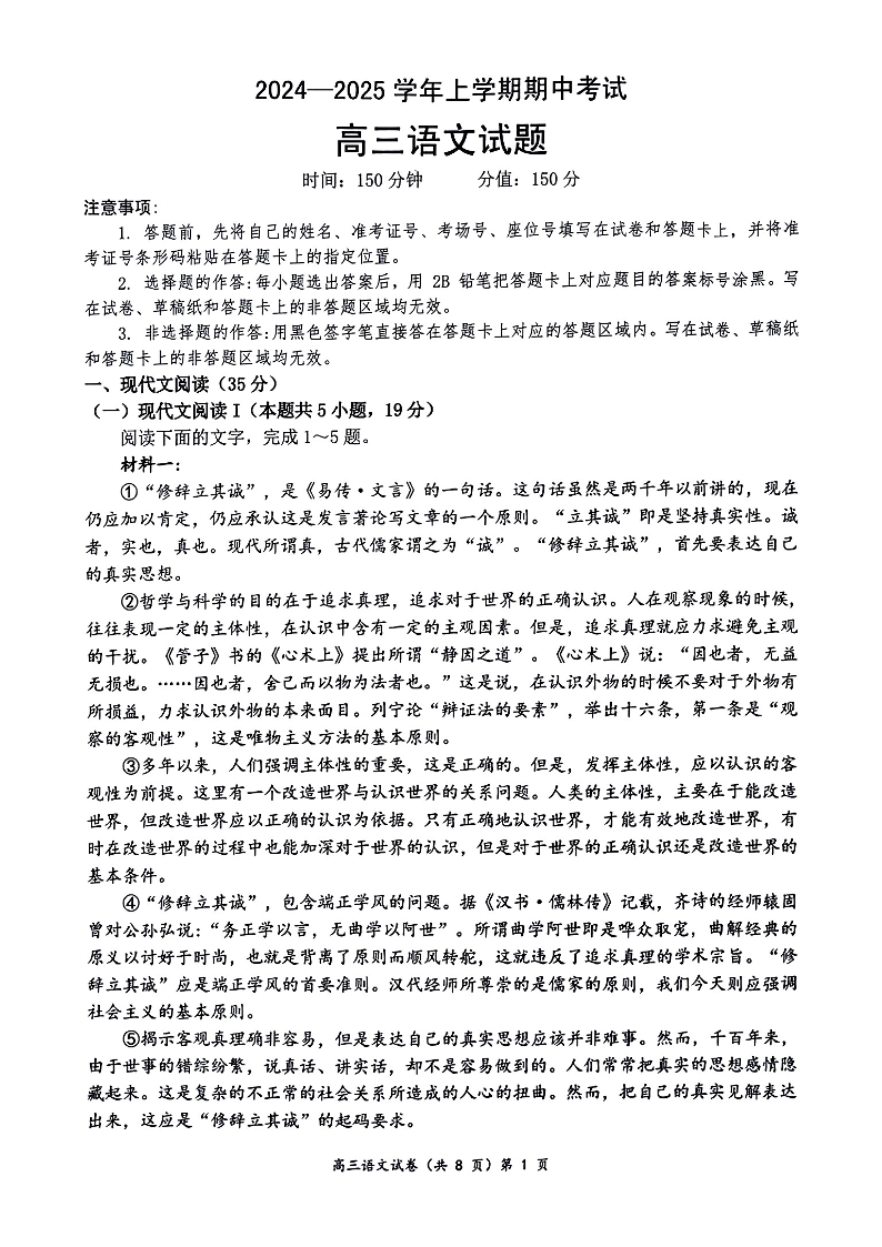 湖北省新高考协作体2024-2025学年高三上学期11月期中考试+语文