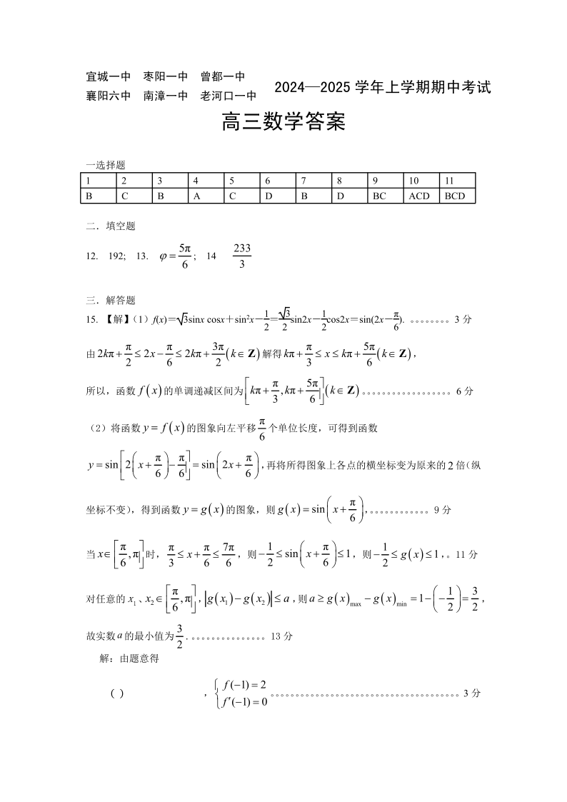 湖北省新高考协作体2024-2025学年高三上学期11月期中考试+数学答案