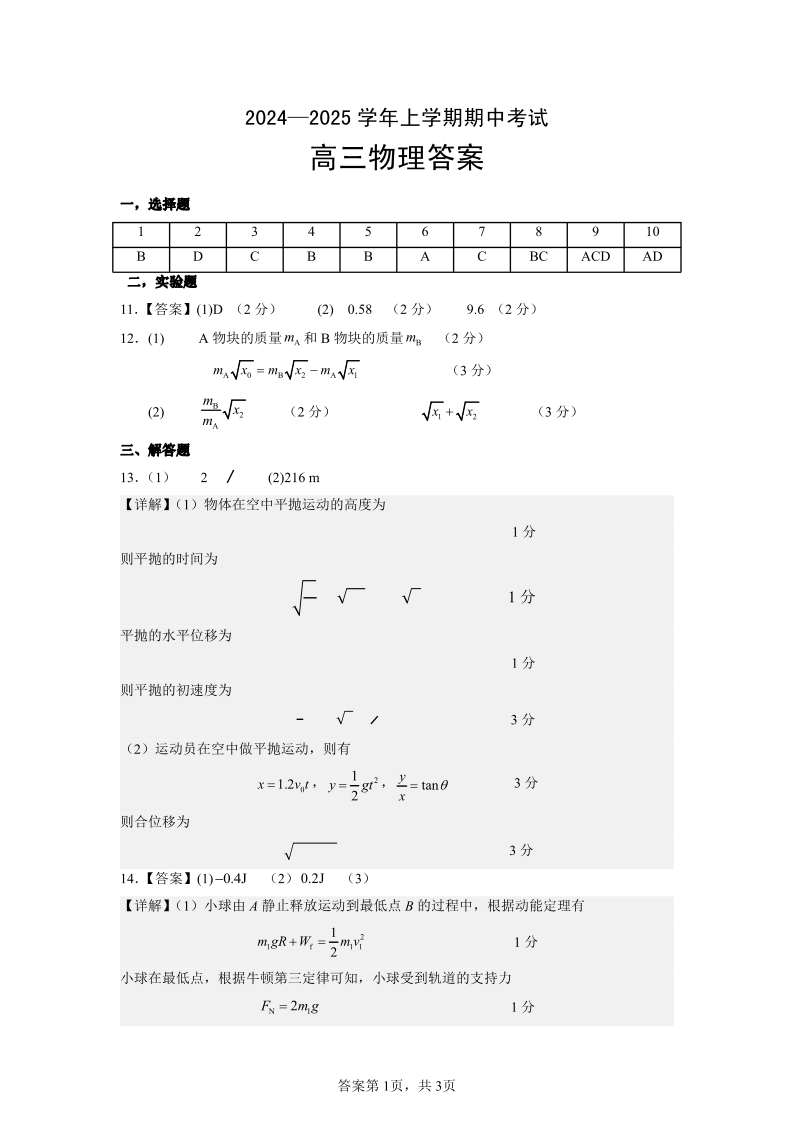 湖北省新高考协作体2024-2025学年高三上学期11月期中考试+物理答案