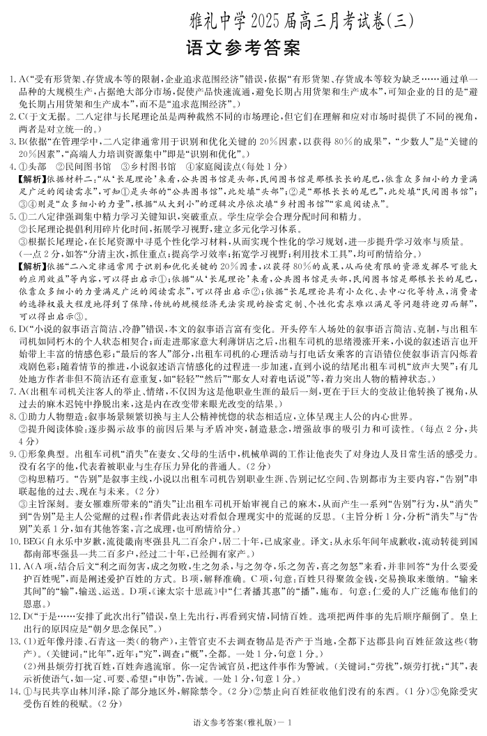 湖南省长沙市雅礼中学2025届高三11月考卷(三)语文答案