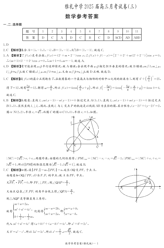 湖南省长沙市雅礼中学2025届高三11月考卷(三)数学答案