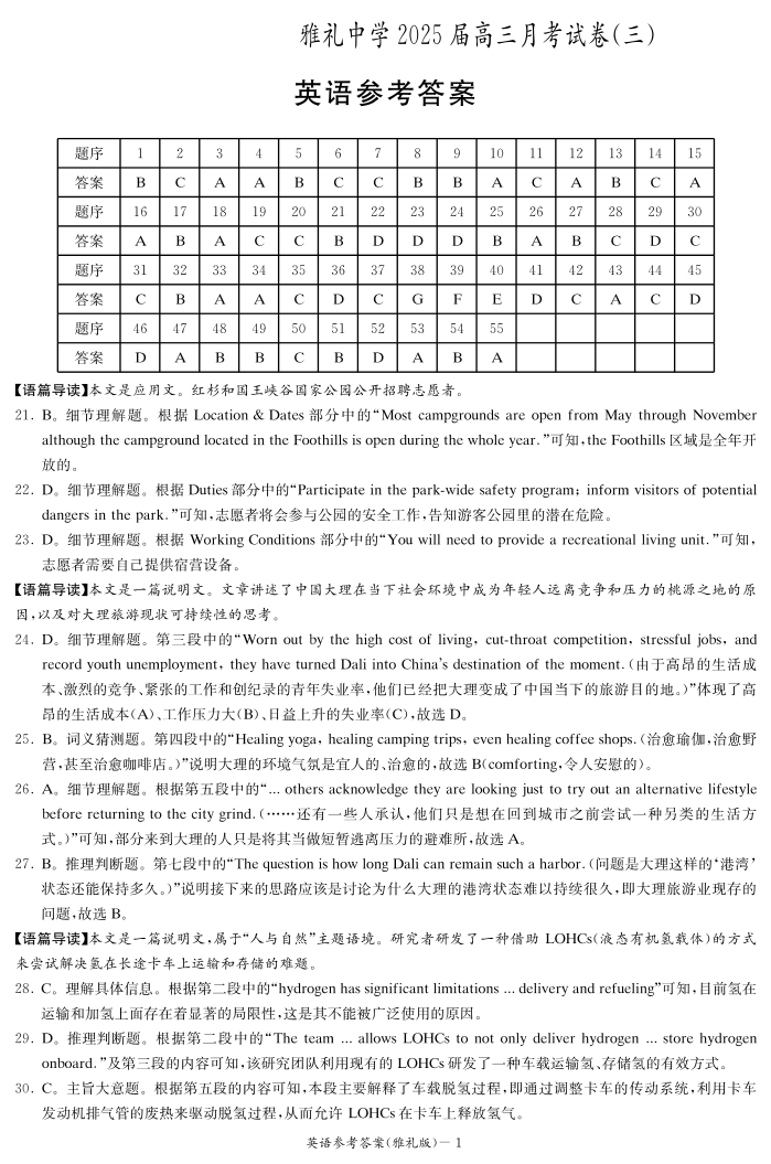 湖南省长沙市雅礼中学2025届高三11月考卷(三)英语答案