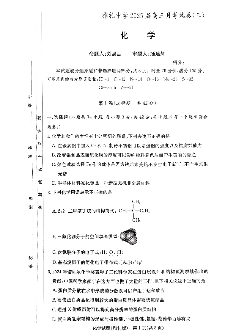 湖南省长沙市雅礼中学2025届高三11月考卷(三)化学试卷