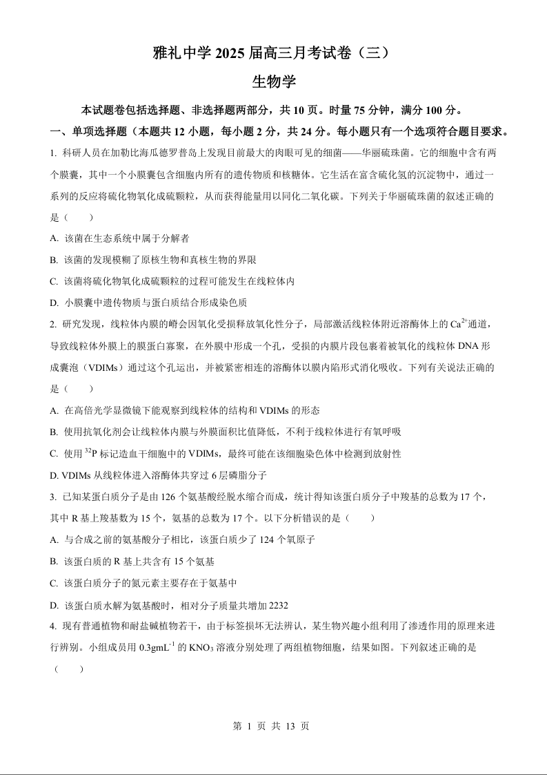 湖南省长沙市雅礼中学2025届高三11月考卷(三)生物试题(原卷版)
