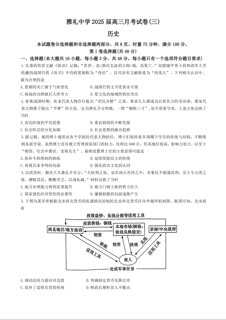 湖南省长沙市雅礼中学2025届高三11月考卷(三)历史及答案