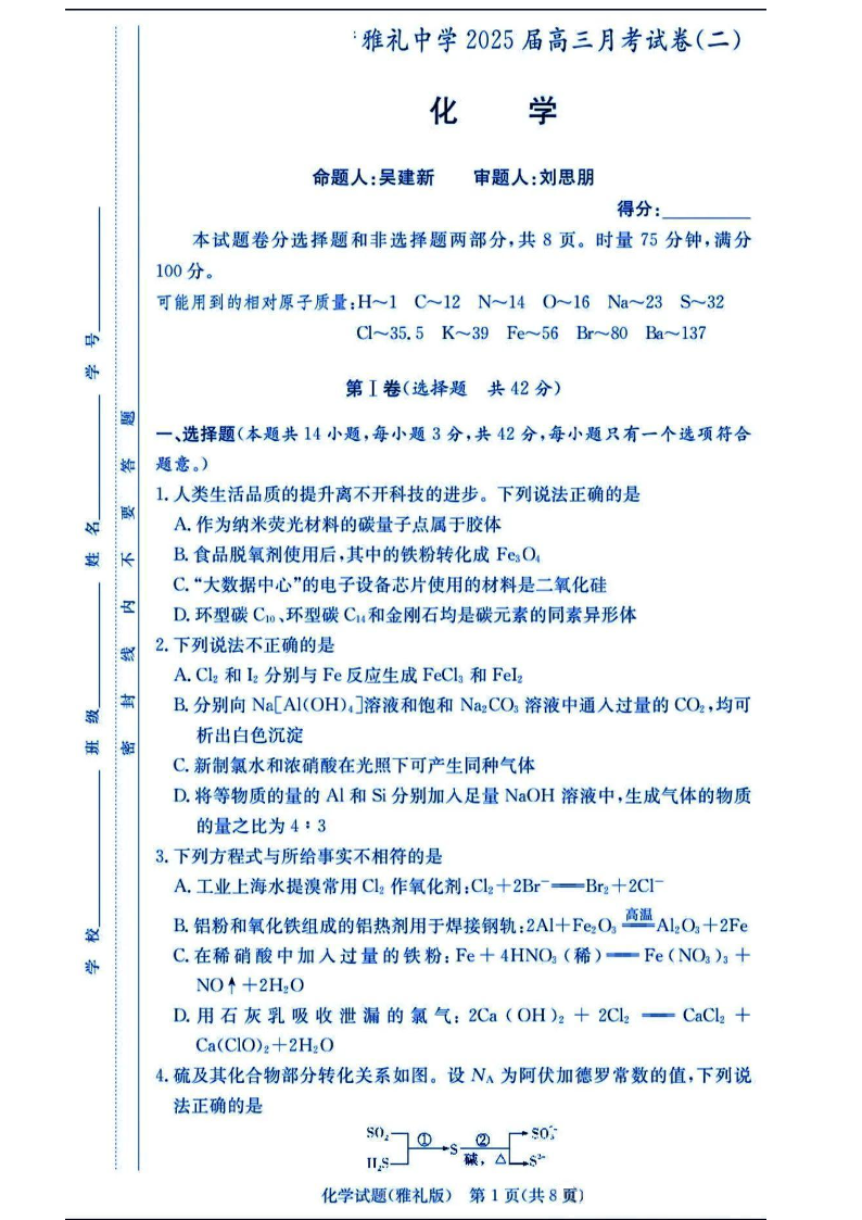 湖南省雅礼中学2025届高三上学期月考试卷(二+)化学