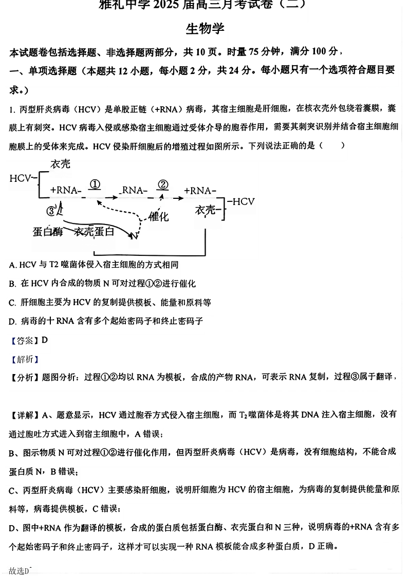 湖南省雅礼中学2025届高三上学期月考试卷(二+)生物