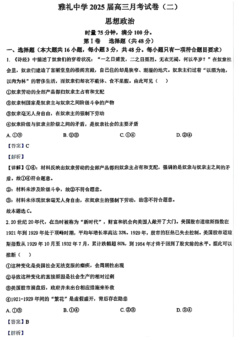 湖南省雅礼中学2025届高三上学期月考试卷(二+)政治
