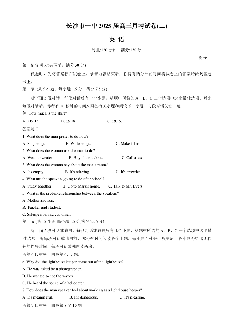 长沙市一中2025届高三月考试卷(二)英语