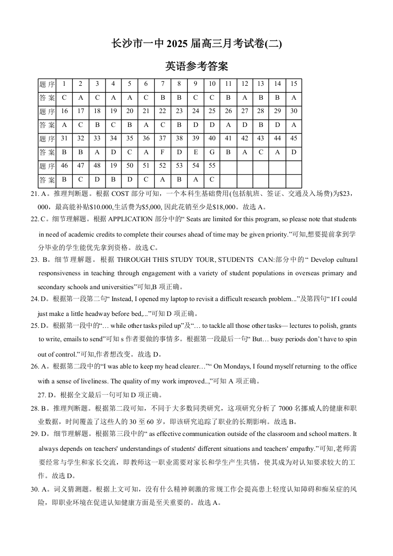 长沙市一中2025届高三月考试卷(二)英语答案