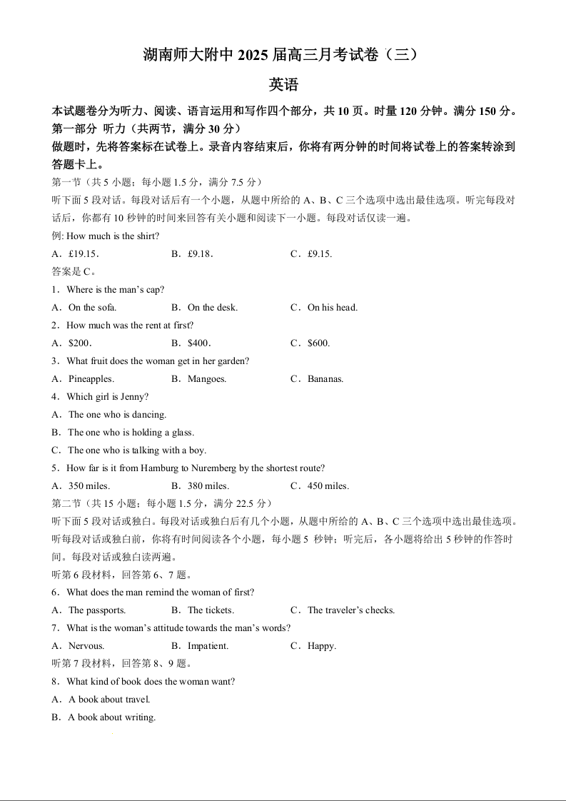 湖南师范大学附属中学2025届高三月考卷(三)英语