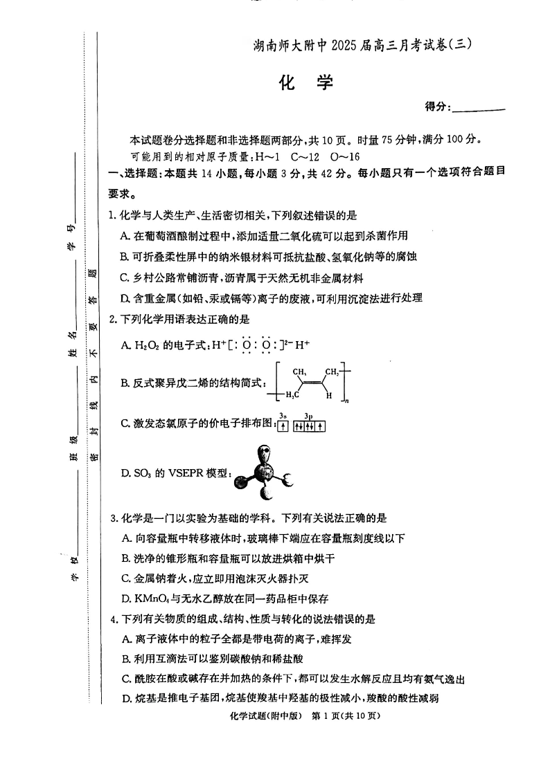 湖南师范大学附属中学2025届高三月考卷(三)化学
