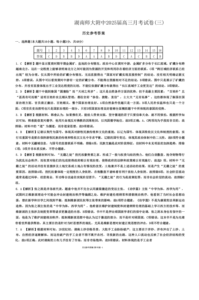 湖南师范大学附属中学2025届高三月考卷(三)历史答案