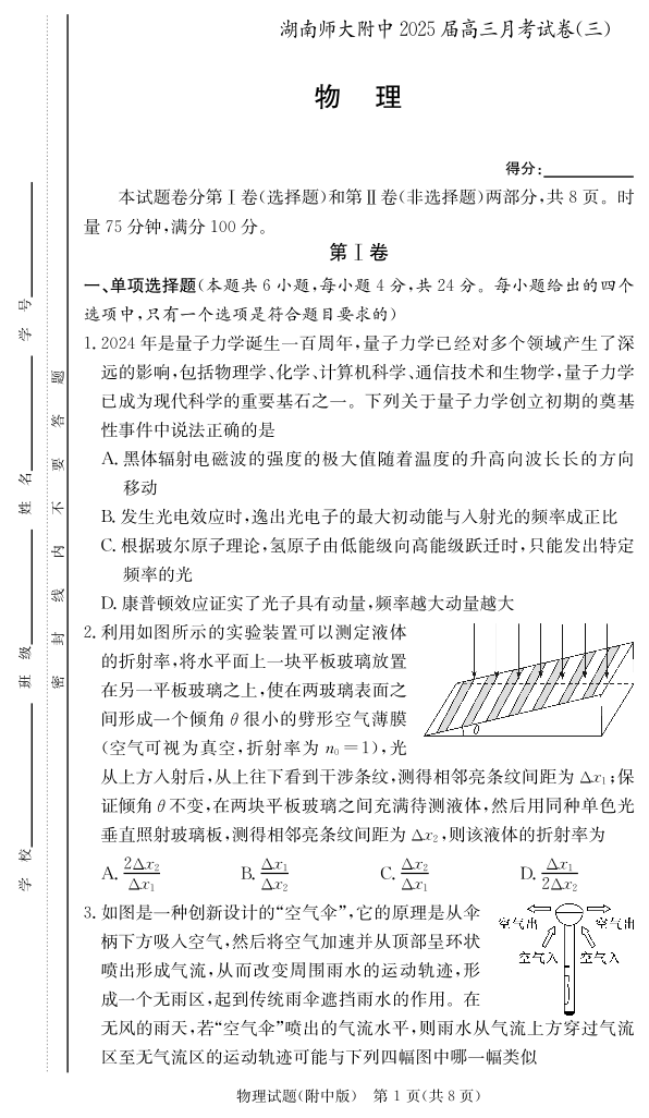 湖南师范大学附属中学2025届高三月考卷(三)物理