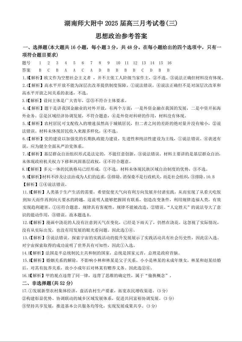 湖南师范大学附属中学2025届高三月考卷(三)政治答案