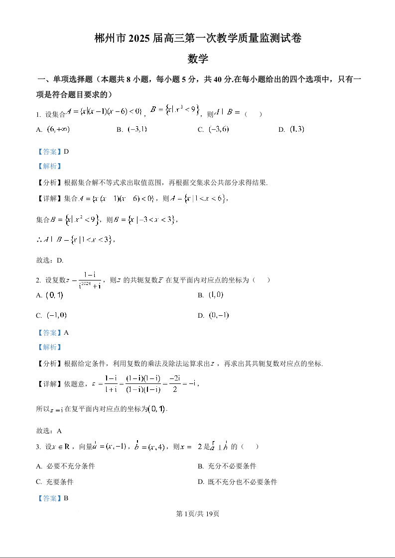 湖南省郴州市2025届高三上学期第一次模拟考试+数学答案