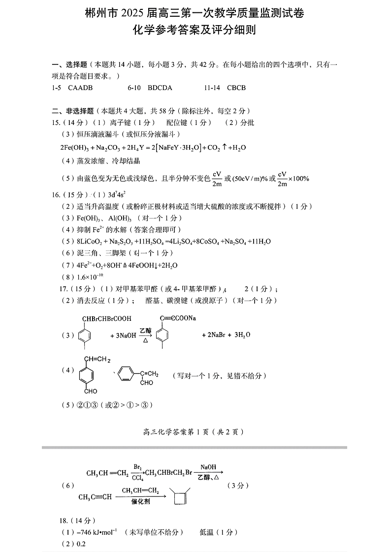湖南省郴州市2025届高三上学期第一次模拟考试+化学答案