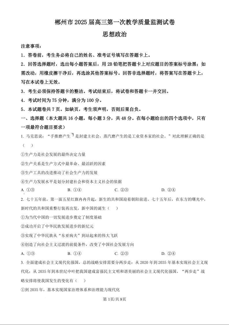 湖南省郴州市2025届高三上学期第一次模拟考试+政治