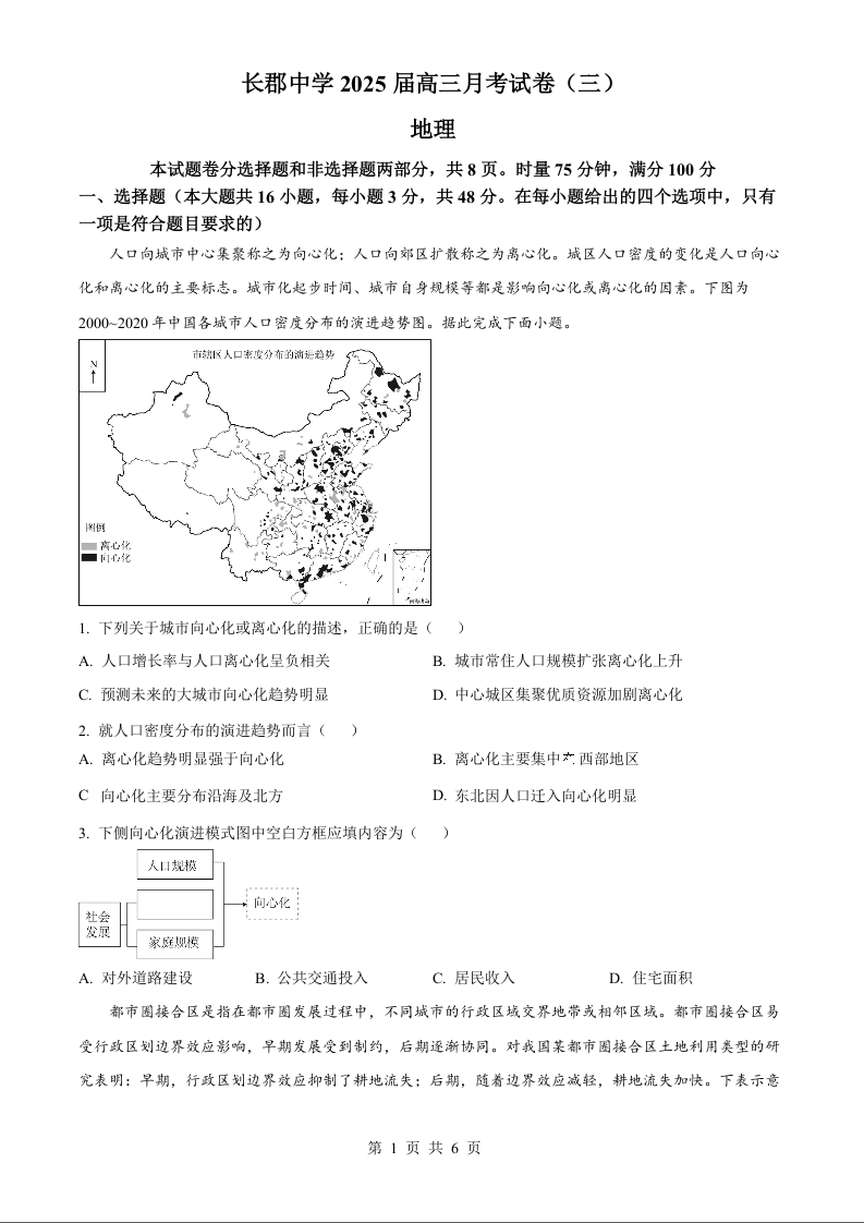 湖南省长沙市长郡中学2024-2025学年高三上学期第三次月考地理试卷