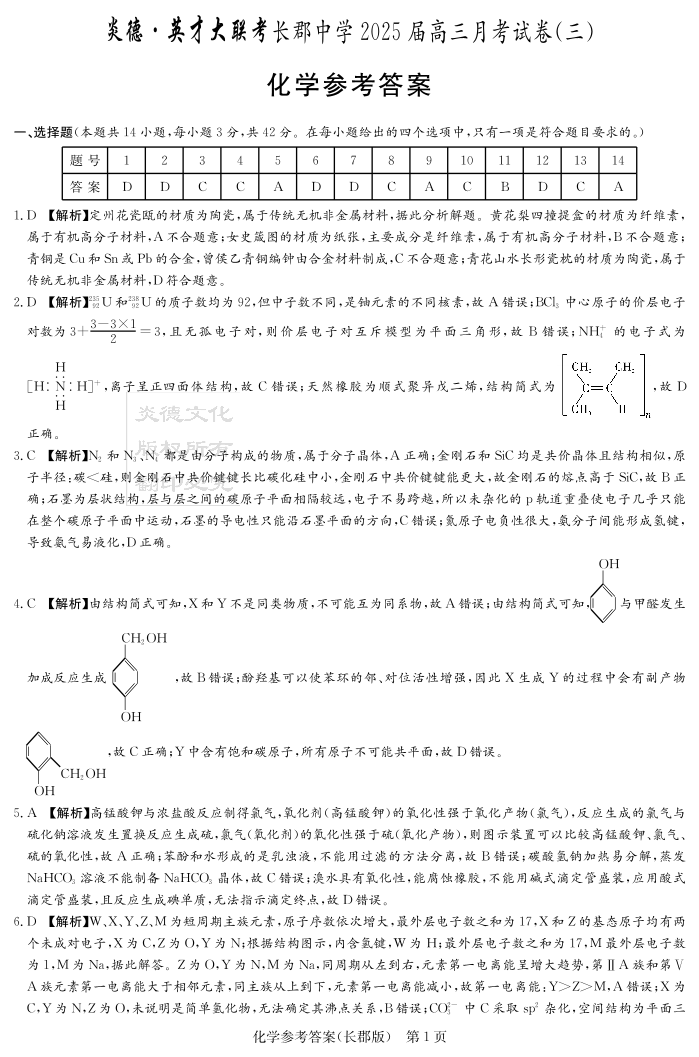 湖南省长沙市长郡中学2024-2025学年高三上学期第三次月考化学答案