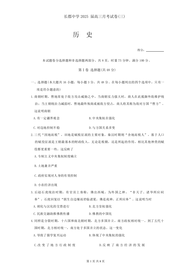 湖南省长沙市长郡中学2024-2025学年高三上学期第三次月考历史试题