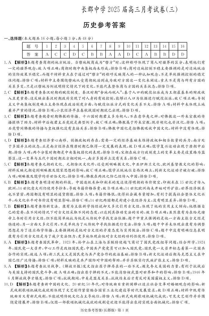 湖南省长沙市长郡中学2024-2025学年高三上学期第三次月考历史答案