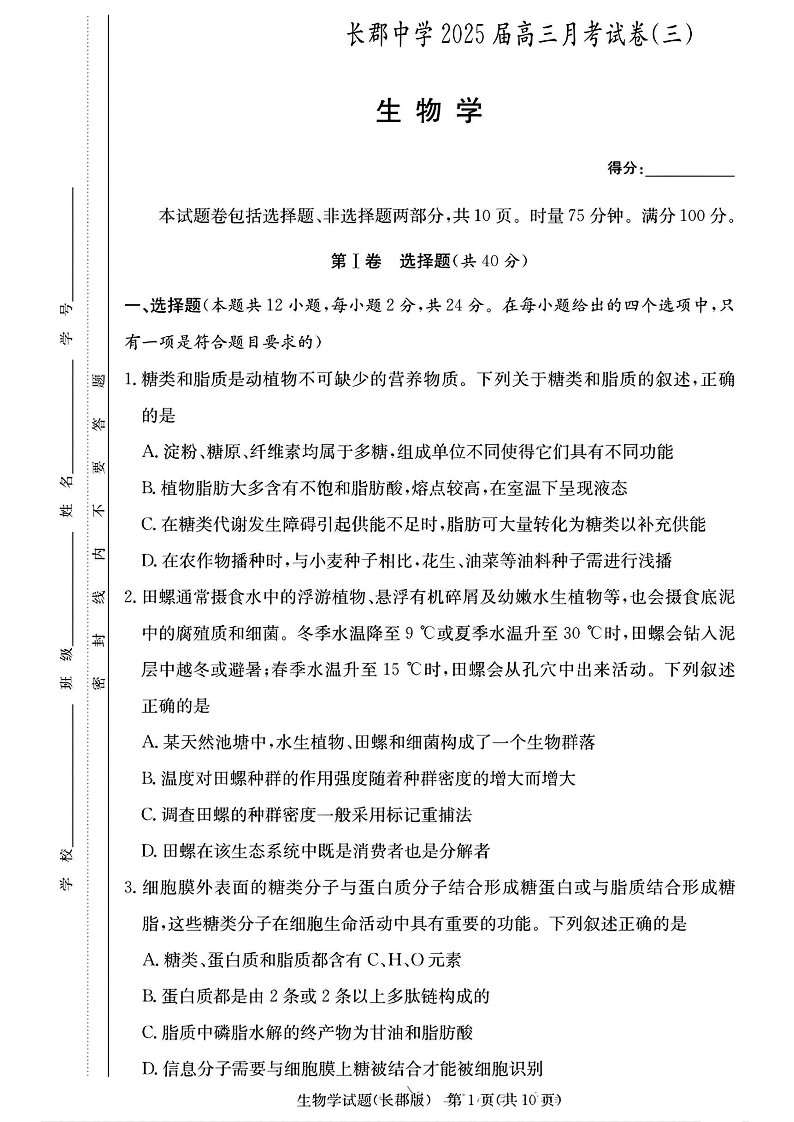 湖南省长沙市长郡中学2024-2025学年高三上学期第三次月考生物试题