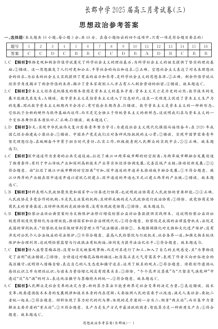湖南省长沙市长郡中学2024-2025学年高三上学期第三次月考政治答案