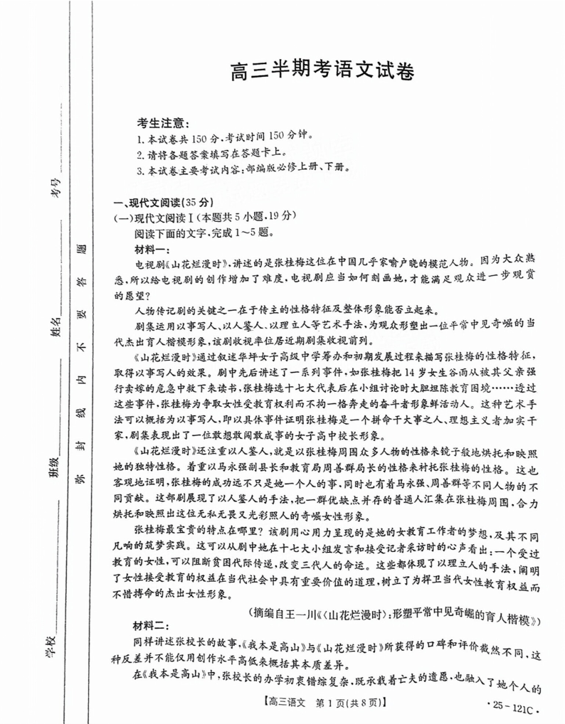 【福建卷】福建省漳州宁德龙岩三市2025届高三百校半期11月联考联考语文试卷+参考答案