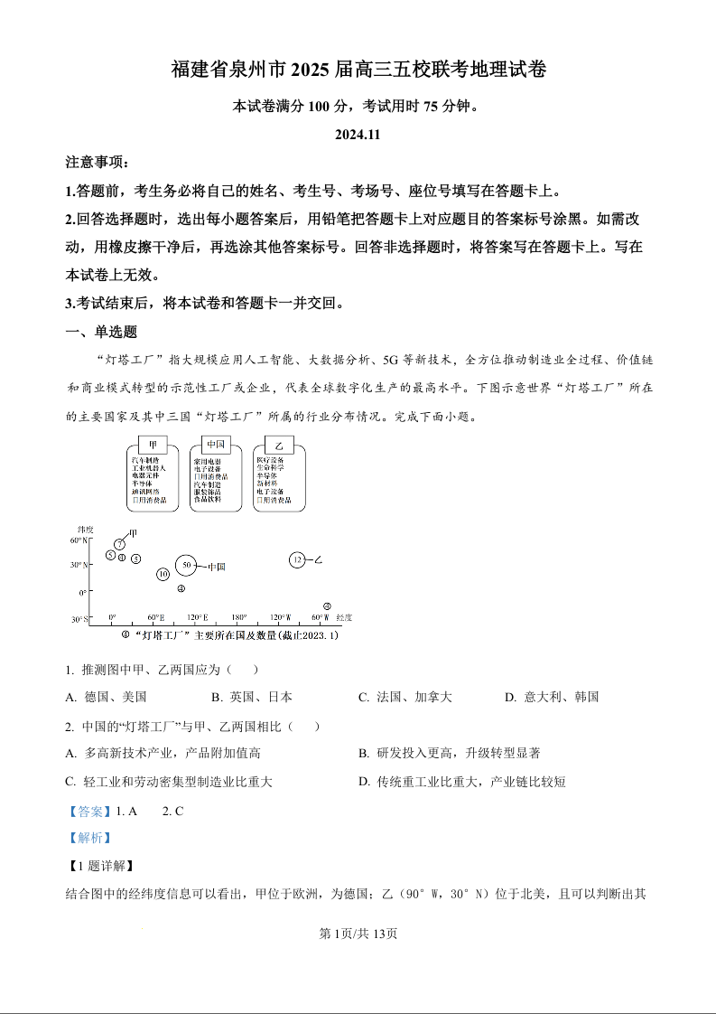 泉州市2025届高三毕业班五校联考+地理答案