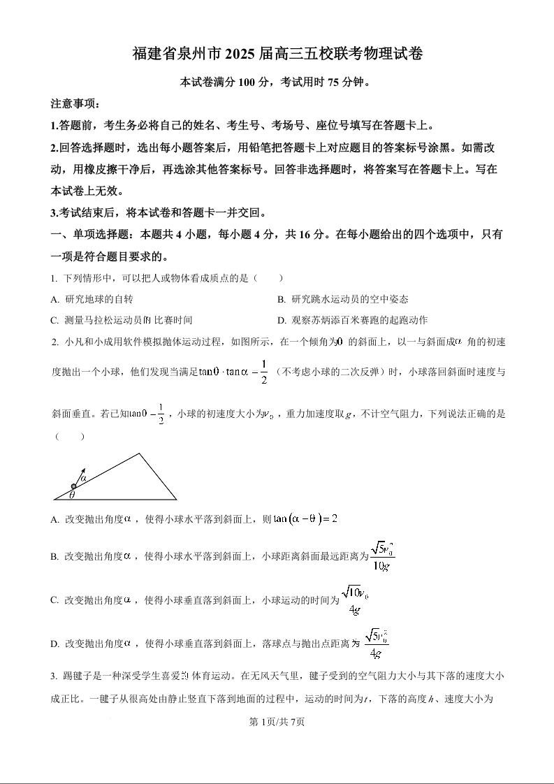 泉州市2025届高三毕业班五校联考+物理